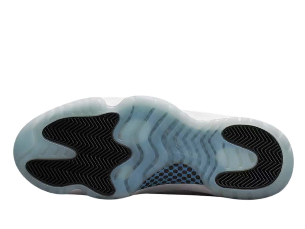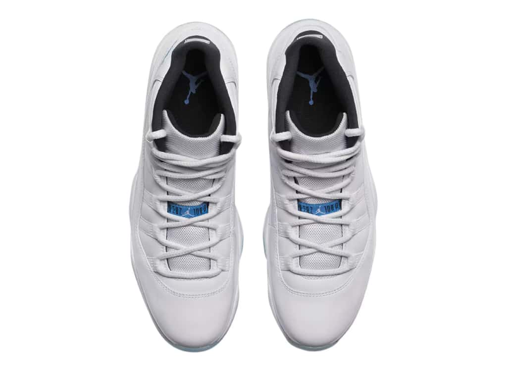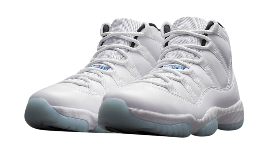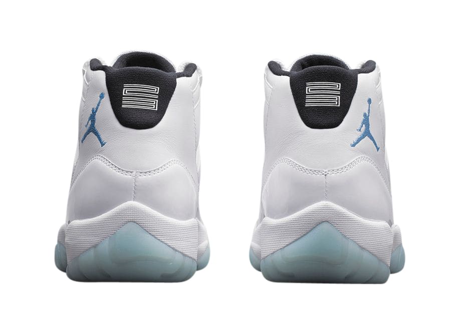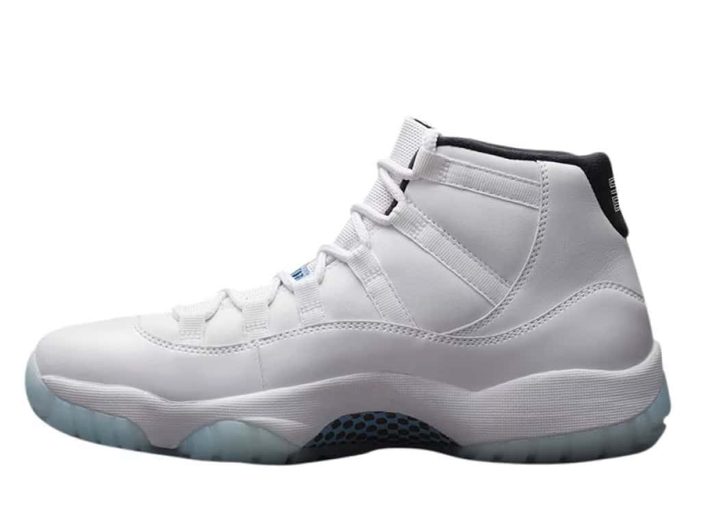 The Air Jordan 11 Retro Legend Blue uses the White/Black/Legend Blue colorway. A white leather upper with white leather overlays top a white patent leather mudguard. A blue Jumpman enhances the white leather collar. Beneath the white laces on the white mesh tongue is a white Jumpman on a blue patch. A black sock lining features a white 23. The white midsole houses a full-length Air unit. The blue translucent rubber of the Air Jordan 11 Retro Legend Blue outsole covers a blue-and-black checked midsole shank with the white outline of a Jumpman.