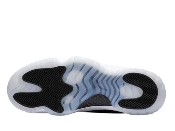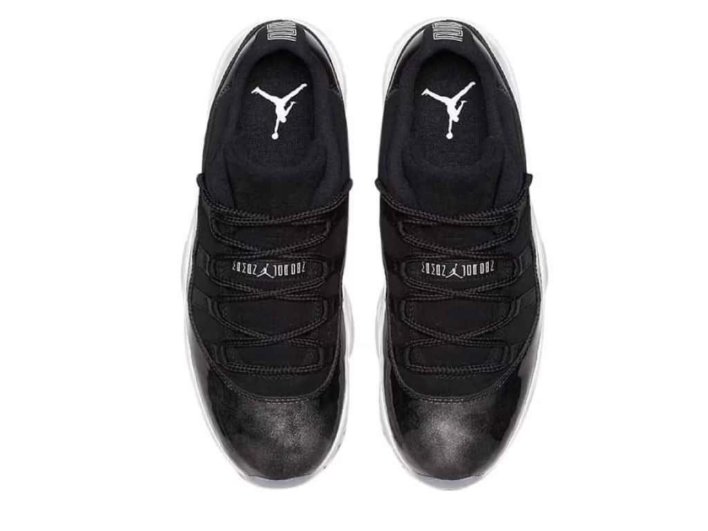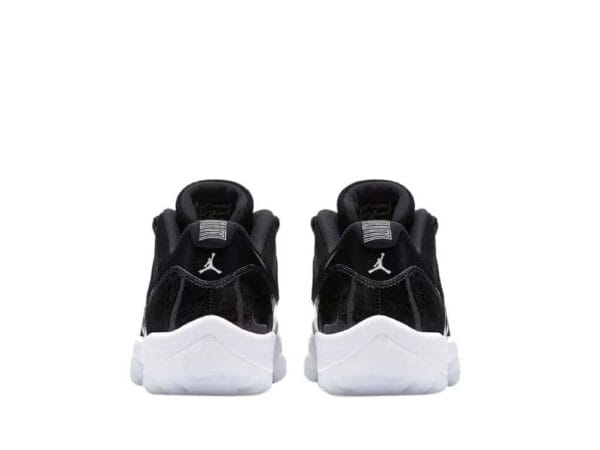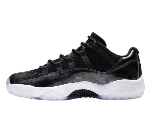 The black nubuck upper of this Low Air Jordan 11 sneaker is highlighted by the metallic silver stitching incorporated into the patent leather overlay. The white midsole and a transparent white outsole of this shoe are contrasted with a black lacing system. AIR technology units on its soles completes the design.