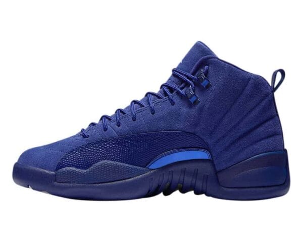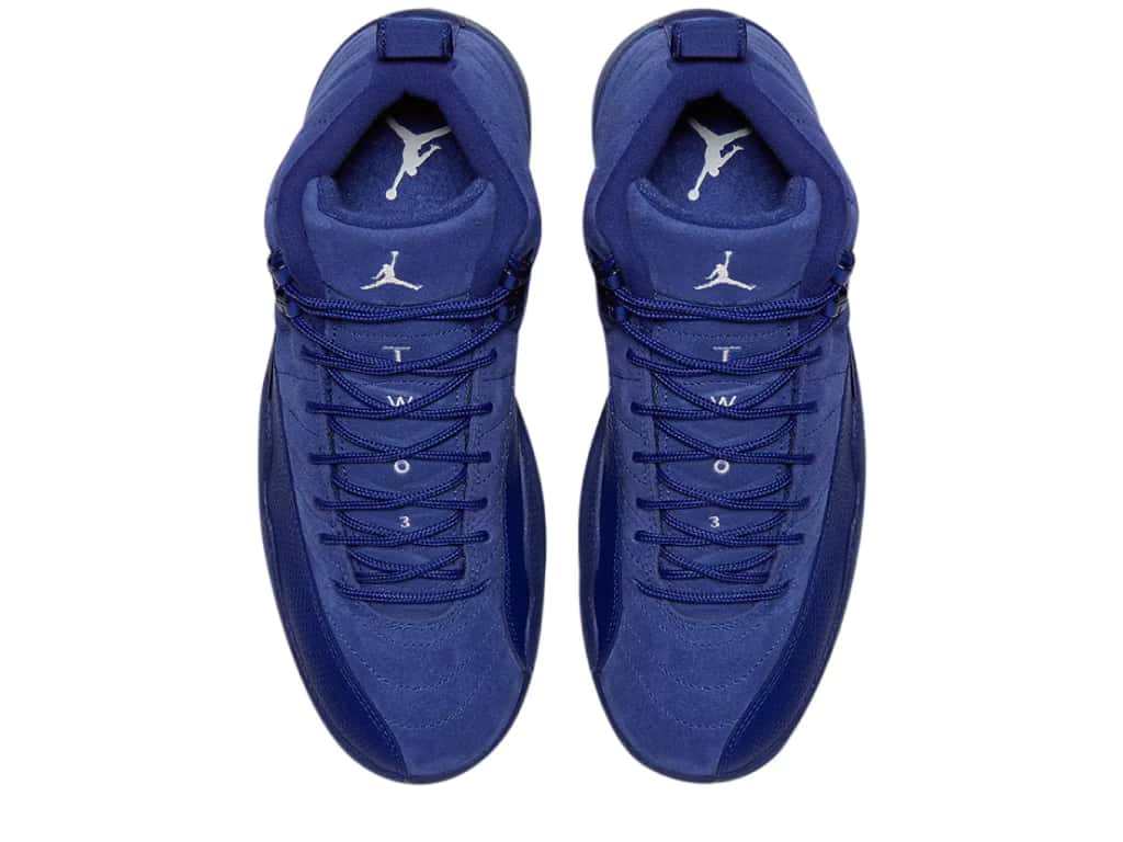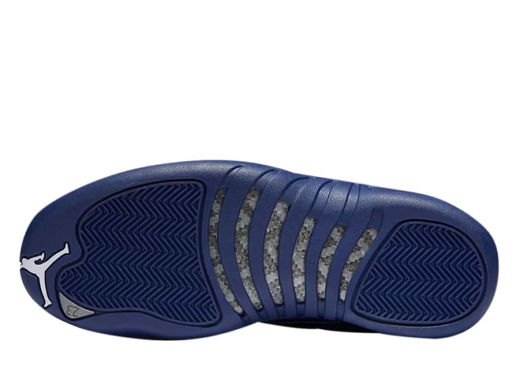 This Retro Air Jordan 12 model comes in deep royal blue – white metallic silver colorway. The sneaker’s mid-top features leather overlays in the same royal blue color. The tongue, heel, and rubber outsole of the shoe boasts contrasting white branding accents. The gray carbon fiber shank is complemented with AIR technology unit soles.
