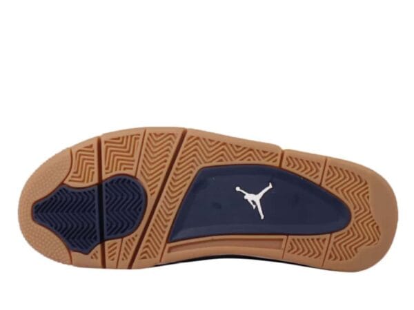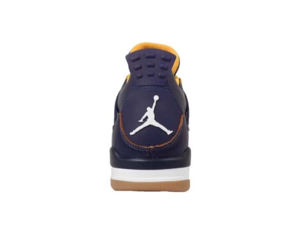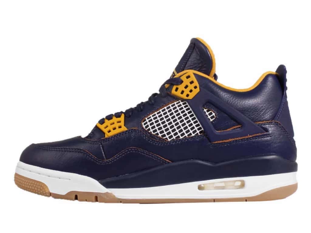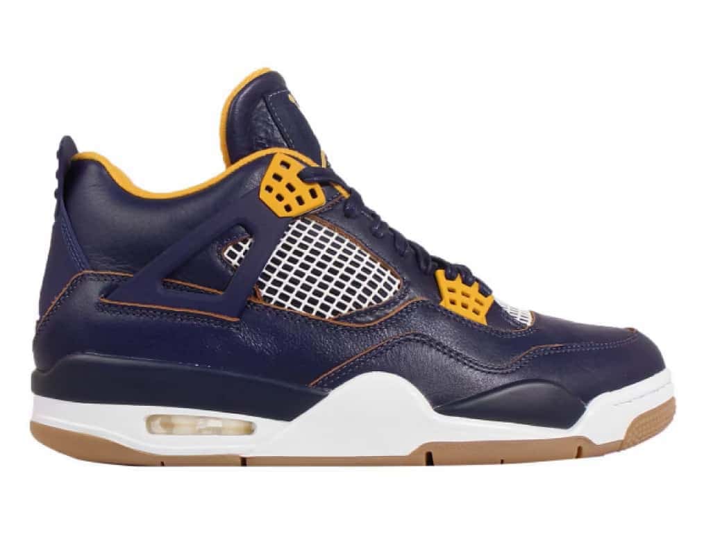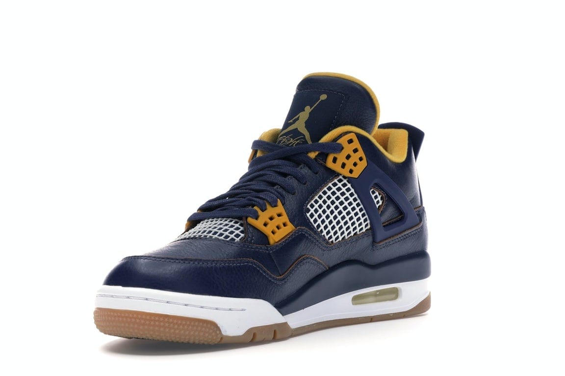 The Air Jordan 4 Retro Dunk From Above features a navy blue leather upper contrasted with white and yellow accents to represent the colors of the sky and a pilot’s uniform. Its upper design also includes metallic gold eyelets that add elegance and a traditional lace-up closure, allowing a secure and adjustable fit. To complete the design is a Jumpman logo on the heel and tongue and Air-Sole units within the forefoot to offer responsive comfort and impact absorption.