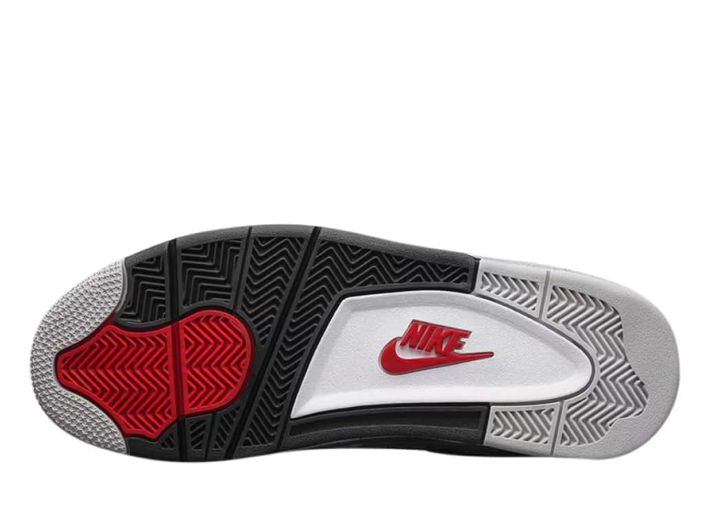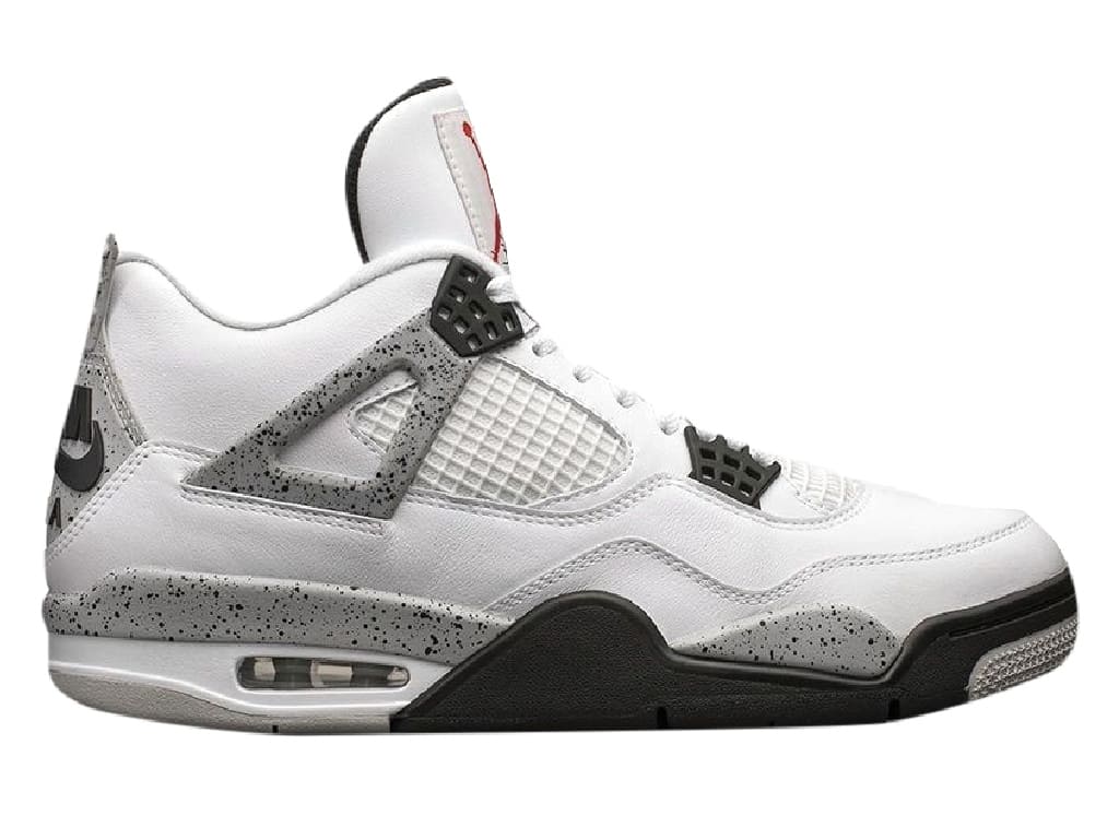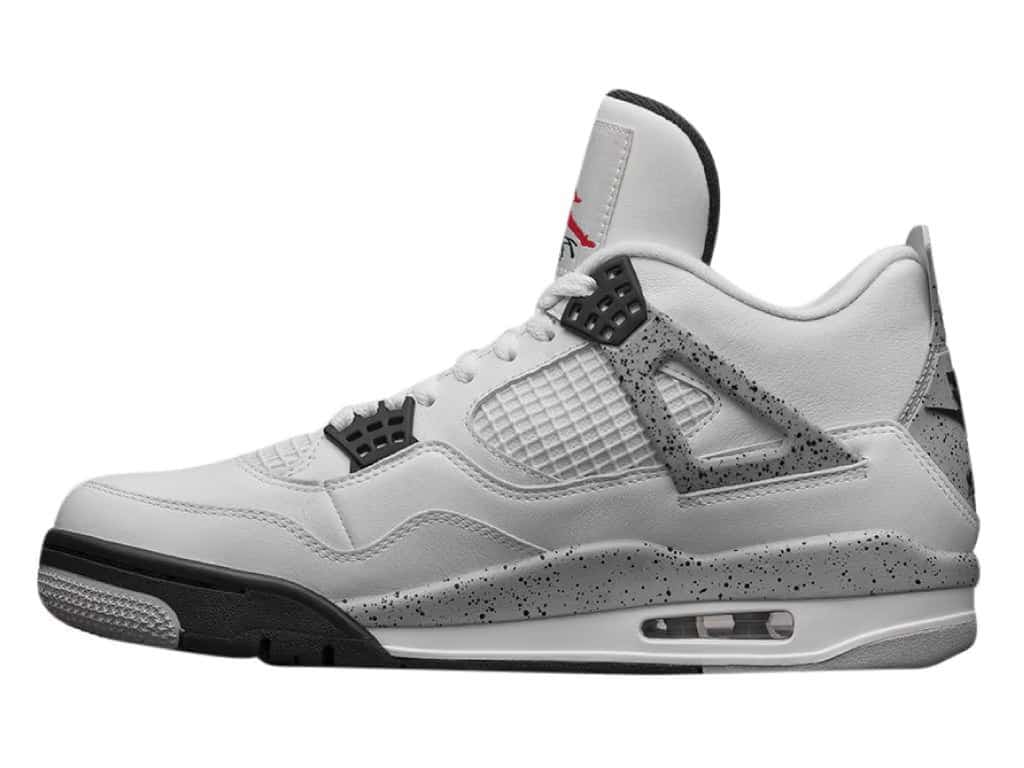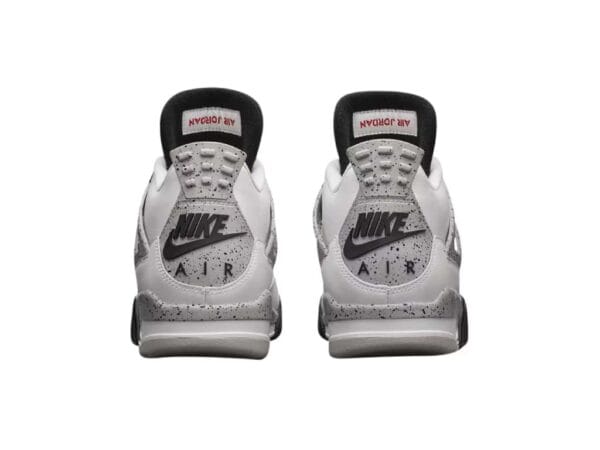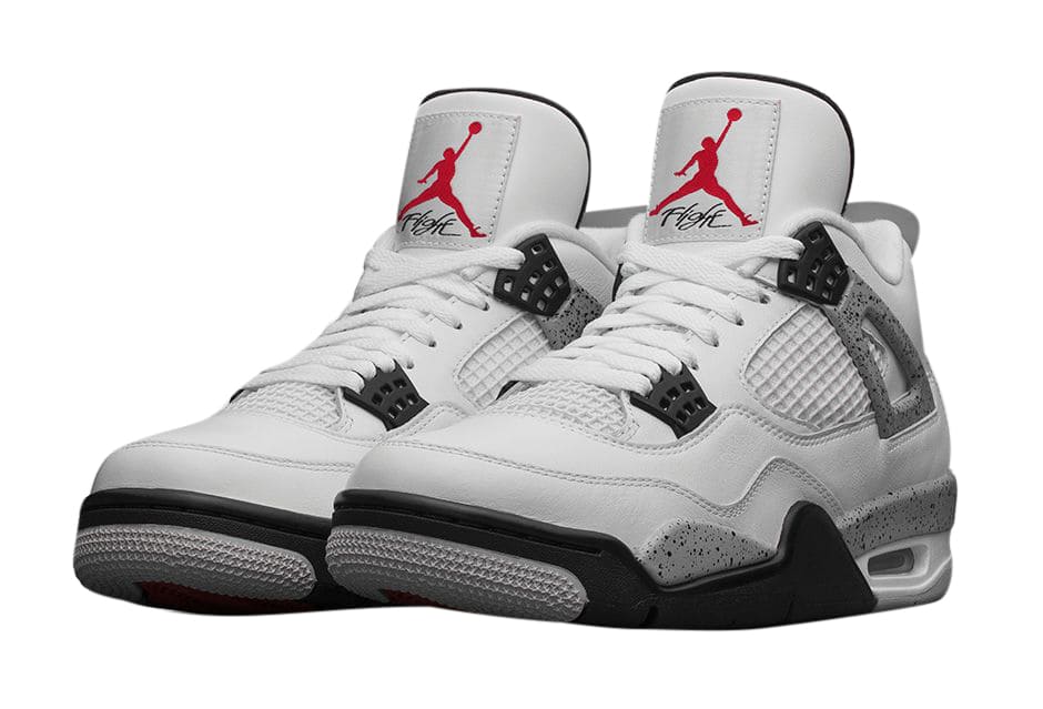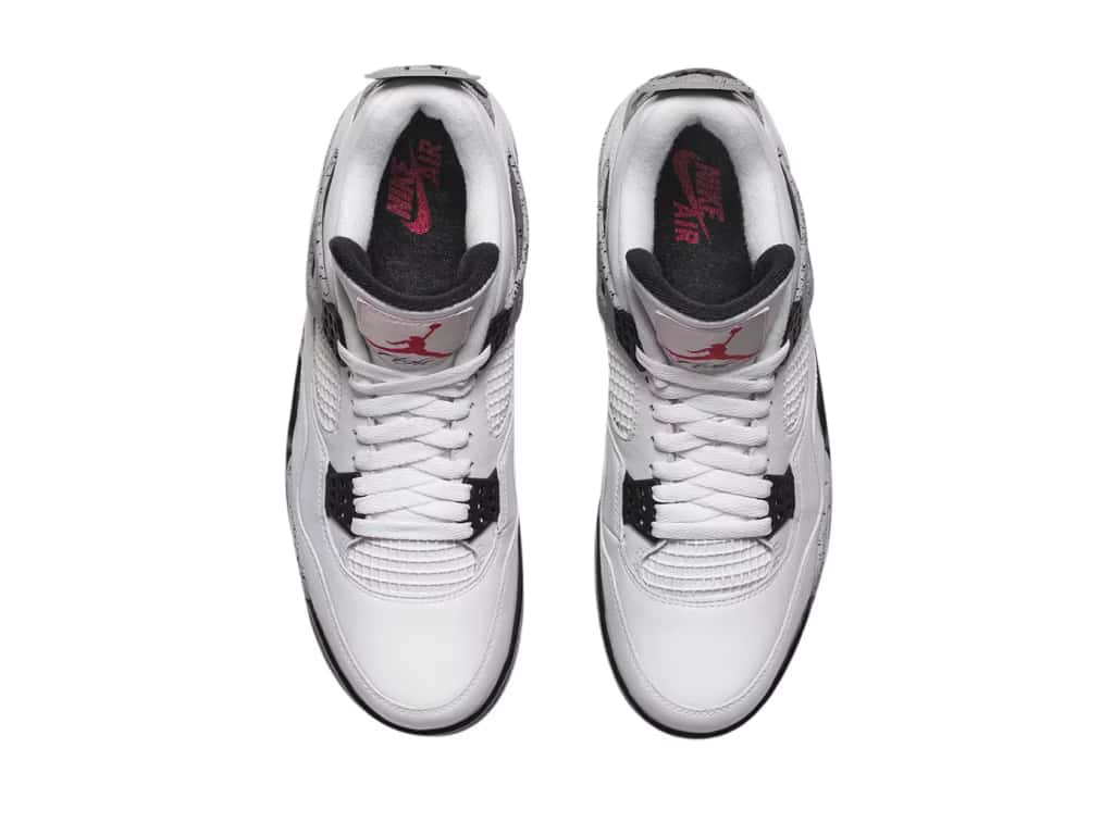 The Air Jordan 4 Retro White Cement 2016 features the classic 1989 colorway White/Fire Red/Black/Tech Gray. Black waffle eyestays and white mesh enhance the white leather upper. “Cement” refers to the black-speckled gray accents on the midsole, wings, and heel. A black Nike Air logo and Swoosh appear just below a cement-pattern heel tab. The white tongue features a red Jumpman above “Flight” printed in black. The black insole has a red Nike Air logo and Swoosh. The white midsole has visible Air. The rubber outsole includes every color in the colorway.