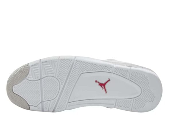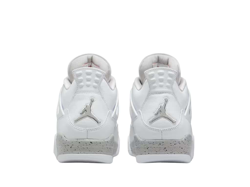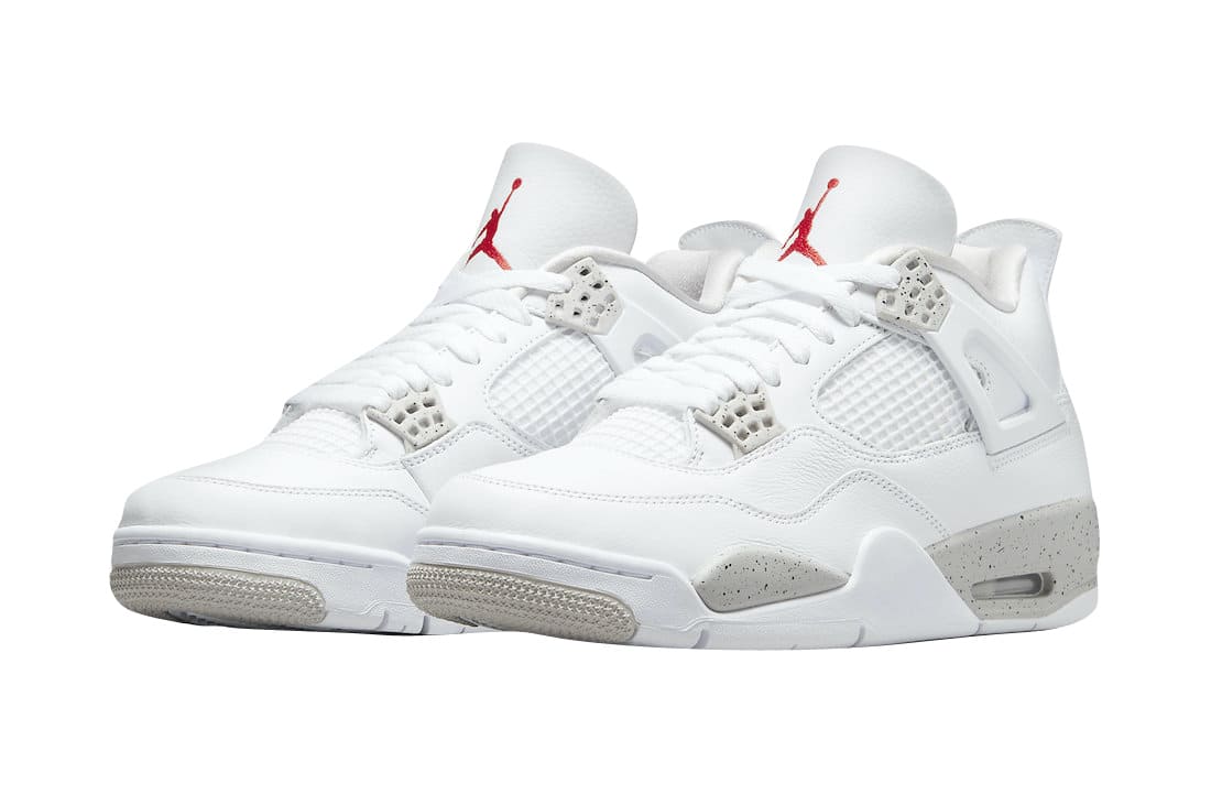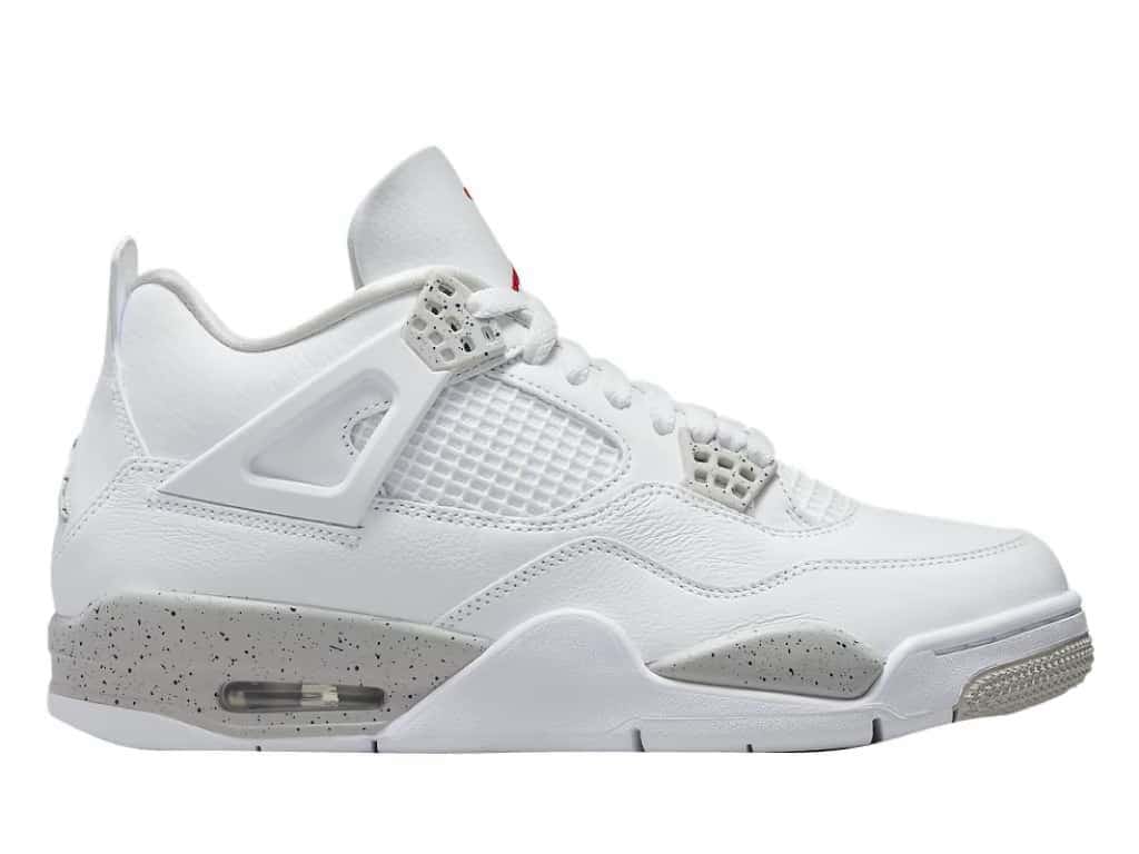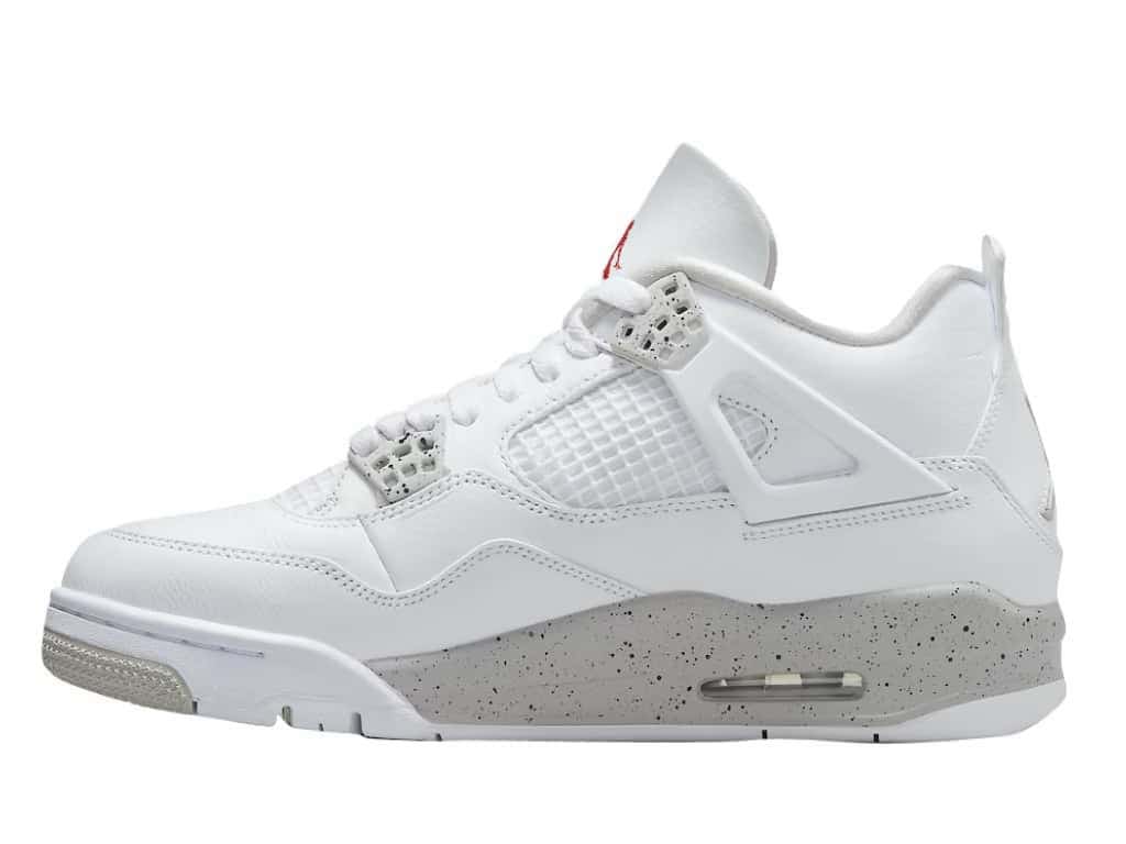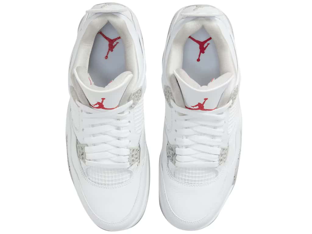 The Air Jordan 4 Retro White Oreo features a white leather and mesh upper with hits of Tech Grey on its eyelets and midsole. From there, a red Jumpman logo is embroidered on the tongue, adding a pop of color to the neutral-toned design.