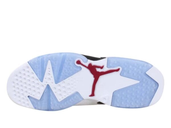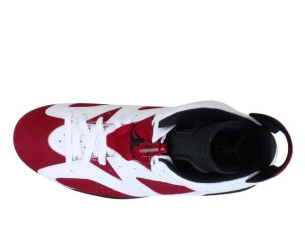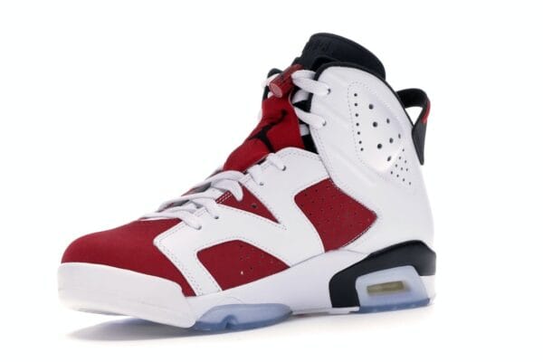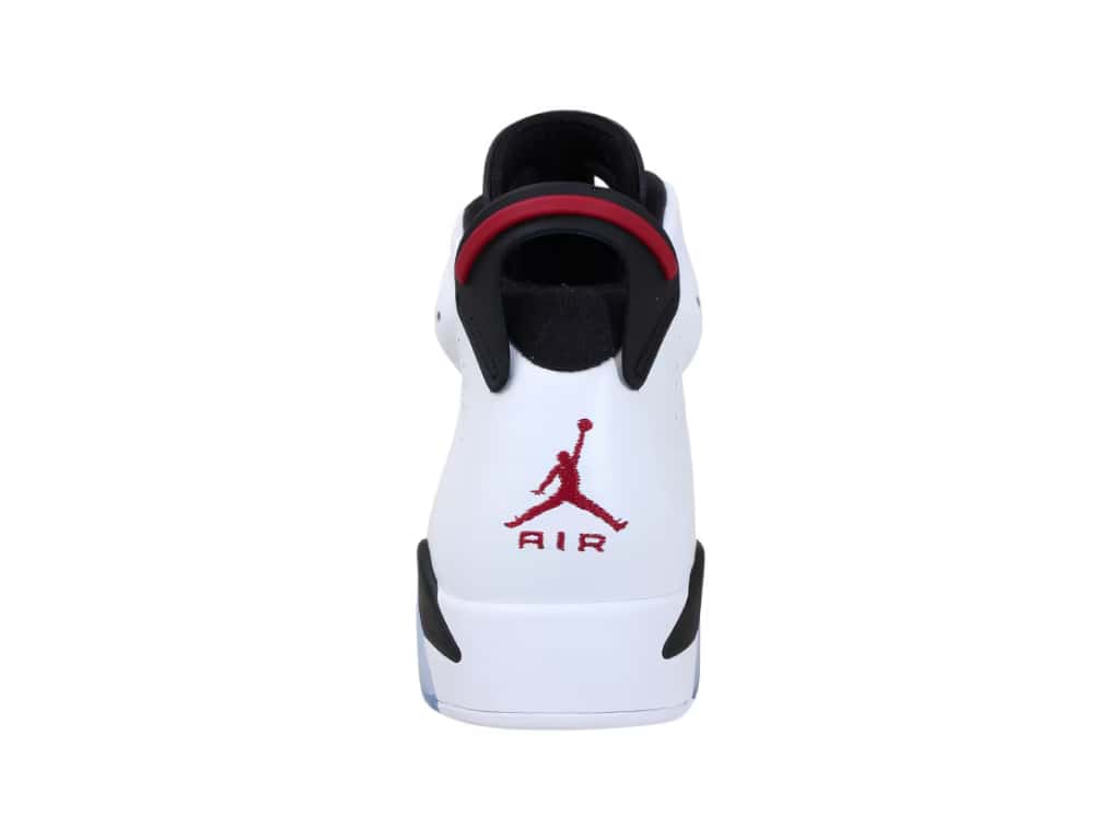 The signature perforated upper of this 2014 Air Jordan 6 sneaker has white overlays that are highlighted by some carmine underlays. The shoe features a bright red hue on its tongue, branding, lacing system, as well as on its heel. A white rubber outsole completes the design.