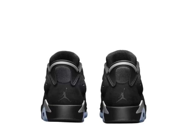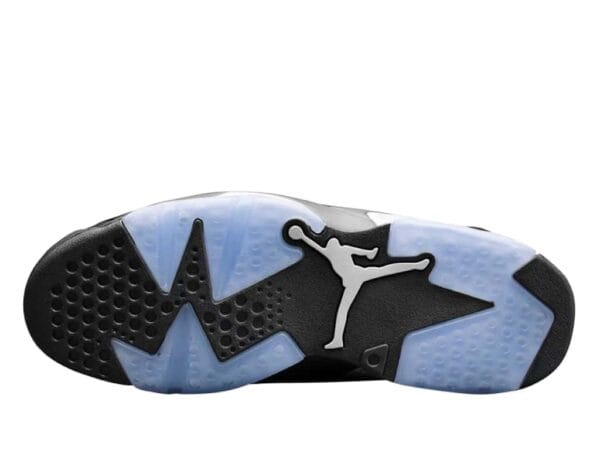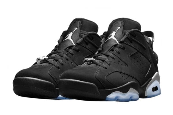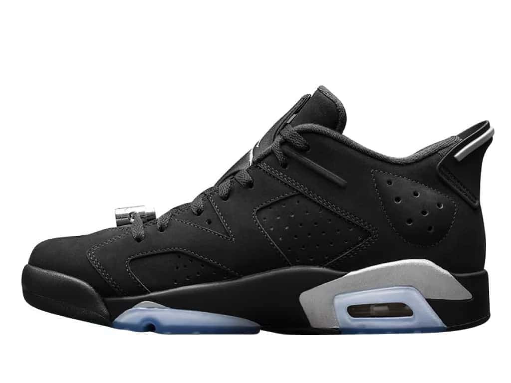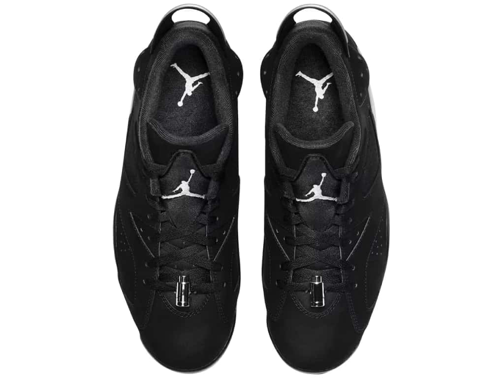 The black nubuck upper of the Jordan 6 Retro Low Golf is enhanced by chrome accents on the lace locks and heel tabs. The inclusion of chrome silver lace locks and a strip on the heel spoiler emanates refinement within the shoe’s design. Further elevating its aesthetics are the embroidered Jumpman logos positioned on the heels and tongues. This golf footwear is equipped with a speckled gray midsole and a translucent outsole specifically designed for golfing purposes. Significantly, the outsole of the shoe showcases black “eyeliner” accents positioned above the translucent soles, accompanied by a speckled pattern.