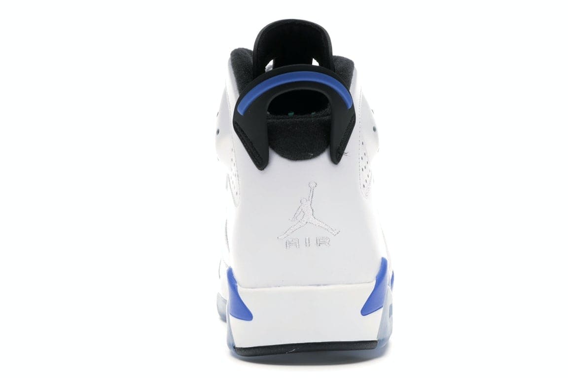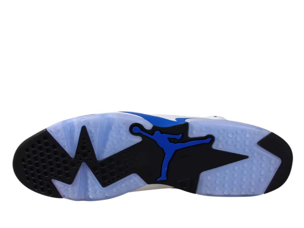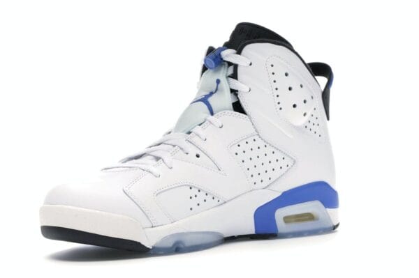 The Jordan 6 Retro Sport Blue (2014) features an upper made of white leather with perforated side panels. The shoe’s outsole is made of rubber to provide grip and longevity. The midsole of these sneakers is outfitted with a visible air cushioning device for comfort and stability. The sneaker features a lace-lock system and a heel pull tab for a snug and comfortable fit. The shoe has the Jumpman logo on both the tongue and heel.