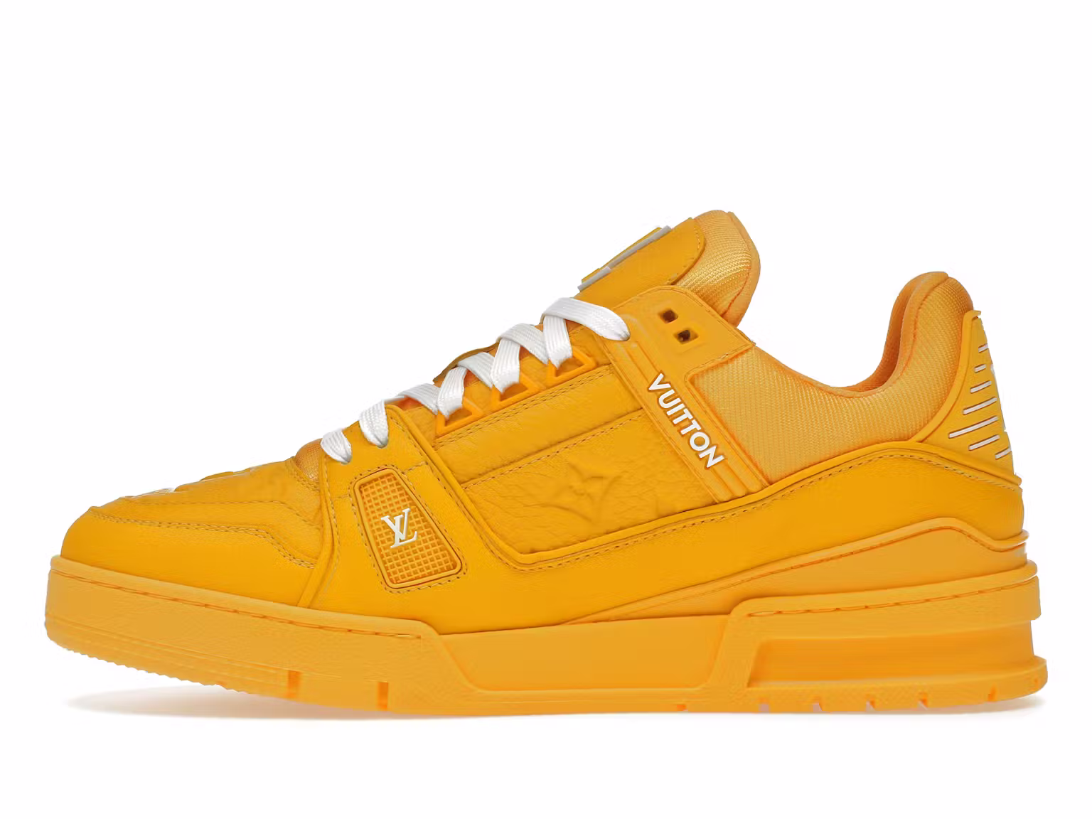 Make a statement with the LV Trainer Sneaker Yellow Embossed Monogram, a fusion of high-fashion and streetwear inspired by vintage basketball kicks. Crafted from premium yellow calf leather with embossed Monogram motifs for a textured, signature Louis Vuitton look, this low-top features a lightweight rubber outsole for flexibility and traction, plus padded insoles for all-day comfort. Subtle LV branding on the tongue and heel adds elegance, while the contrasting white laces and details create a vibrant, versatile vibe perfect for casual outings or elevating everyday outfits.