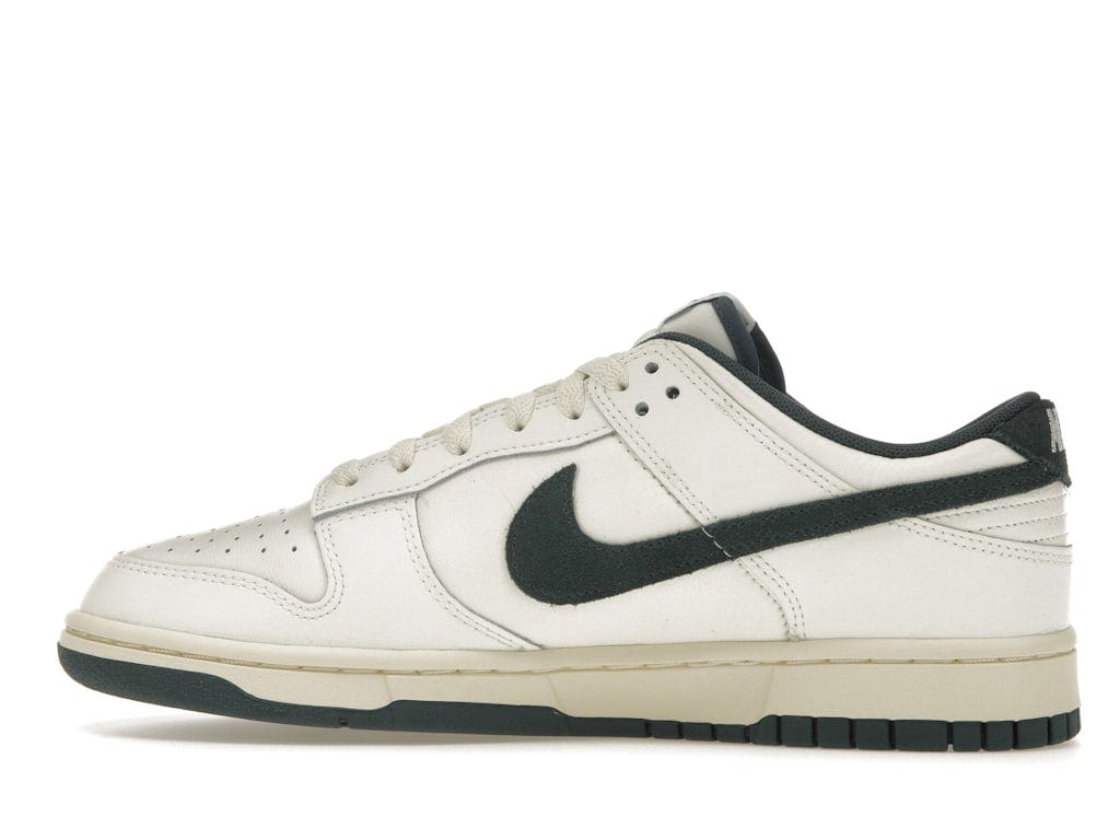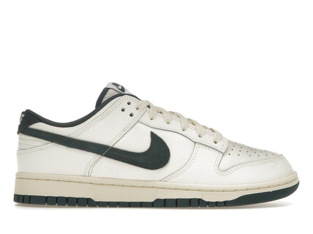 The “Deep Jungle” colorway includes Sail, Deep Jungle, Coconut Milk, and White, which presents as a white base with dark green details. The smooth leather upper comes in Coconut Milk, which contrasts the Deep Jungle found on the suede Swooshes, inner liner, heel tab, and rubber outsole. The sneaker boasts minimal branding, including ‘NIKE’ stitched across the heel tab and the Nike label on the tongue.