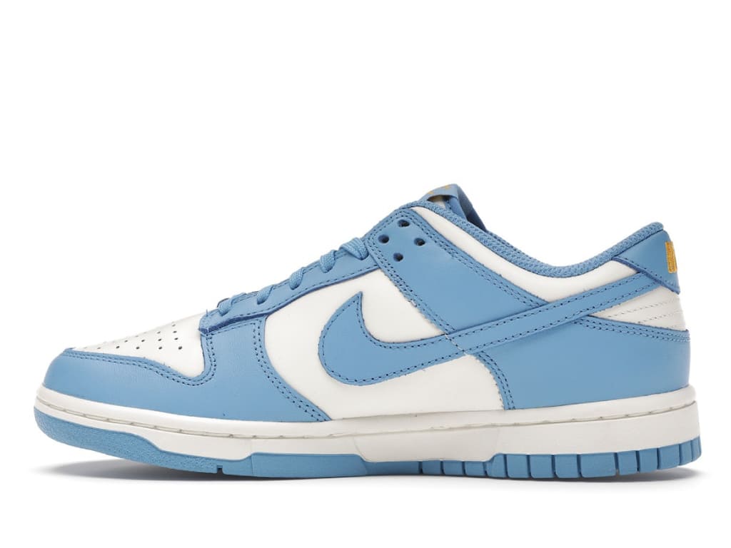 Nike paid homage to the West Coast with the women’s Nike Dunk Low Coast. The Coast colorway is reminiscent of UCLA Bruin school colors, prominently featuring light blue, white, and yellow. White and light blue leather comprise the upper of the Nike Dunk Low Coast, with white on the vamp and medial panels and light blue on the overlay and Swoosh. Hits of yellow are present in the Nike Air branding on the tongue and heel. A white midsole and light EVA outsole complete the design.