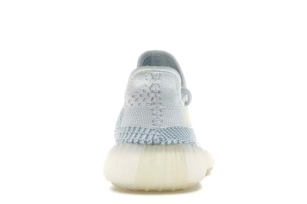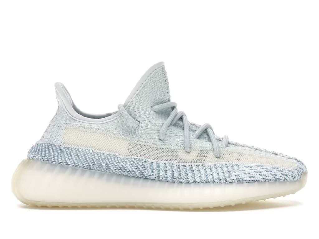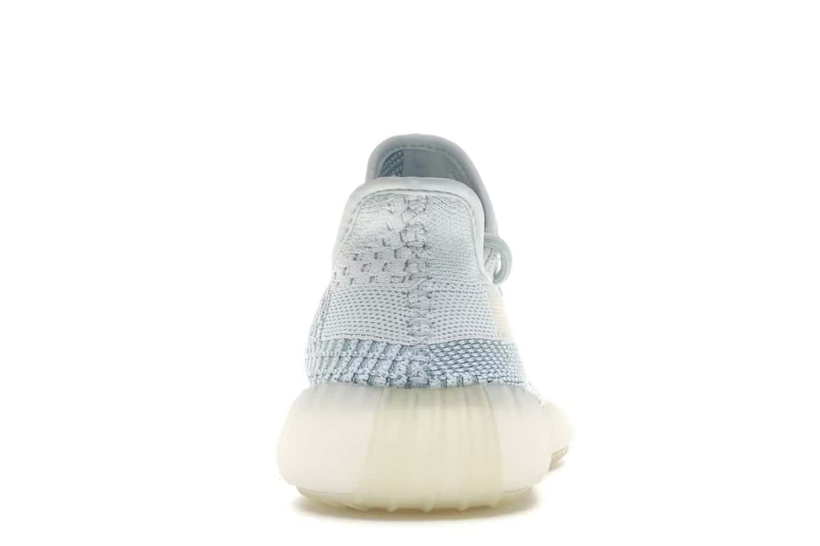 The adidas Yeezy Boost 350 V2 Cloud White (Non-Reflective) combines shades of cream and bluish-white to recreate the hue of a fluffy cloud. A hard sole offers a contrast to the elastic shoelaces and knitted fabric upper. Instead of separate overlays, the upper has the appearance of a single stitched-together piece. One side of the sneaker offers a transparent strip, and the other highlights the blue-and-white patterns. The adidas Yeezy Boost 350 V2 Cloud White (Non-Reflective) uses Primeknit to create a woven textile appearance.