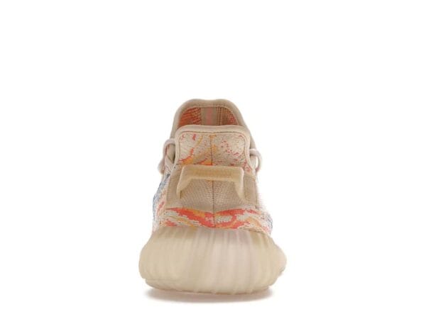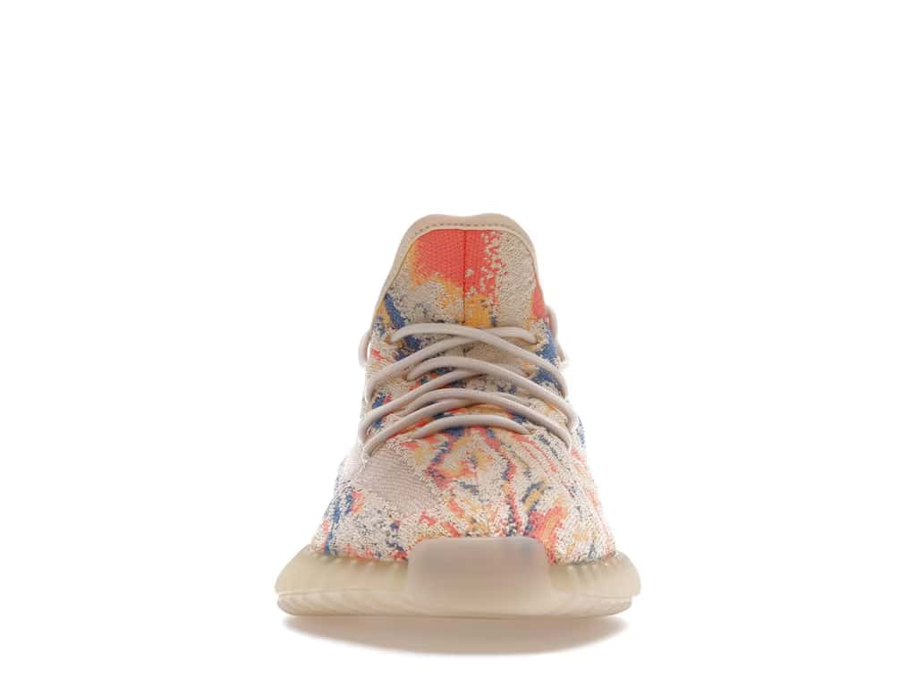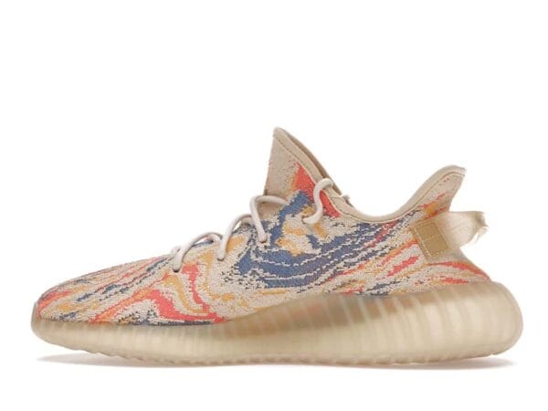The adidas Yeezy Boost 350 V2 MX Oat features a yellow, orange, and blue swirl-patterned Primeknit upper with a mesh side stripe and yellow heel tab. From there, a semi-translucent Boost midsole and pale yellow rope laces complete the design.