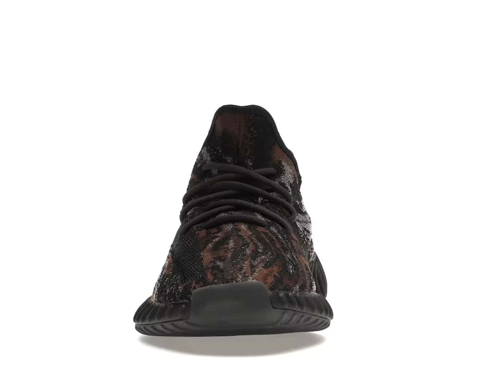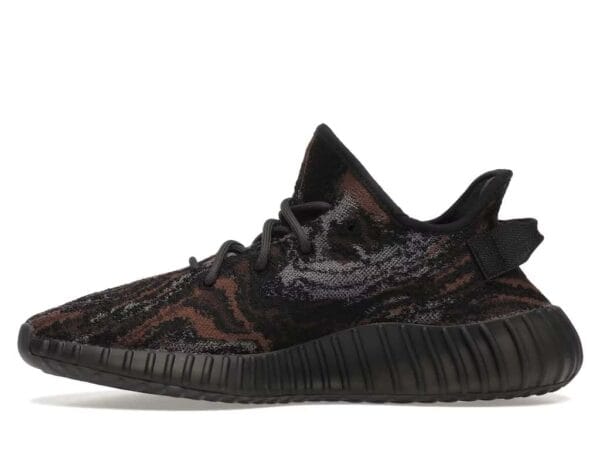 The adidas Yeezy Boost 350 V2 MX Rock features a marbled black, grey, and brown Primeknit upper styled in a pattern similar to the Yeezy 350 V2 MX Oat, only with dark tones. In signature fashion, a cushioned Boost sole, heel tab, and mesh side stripe complete the design.